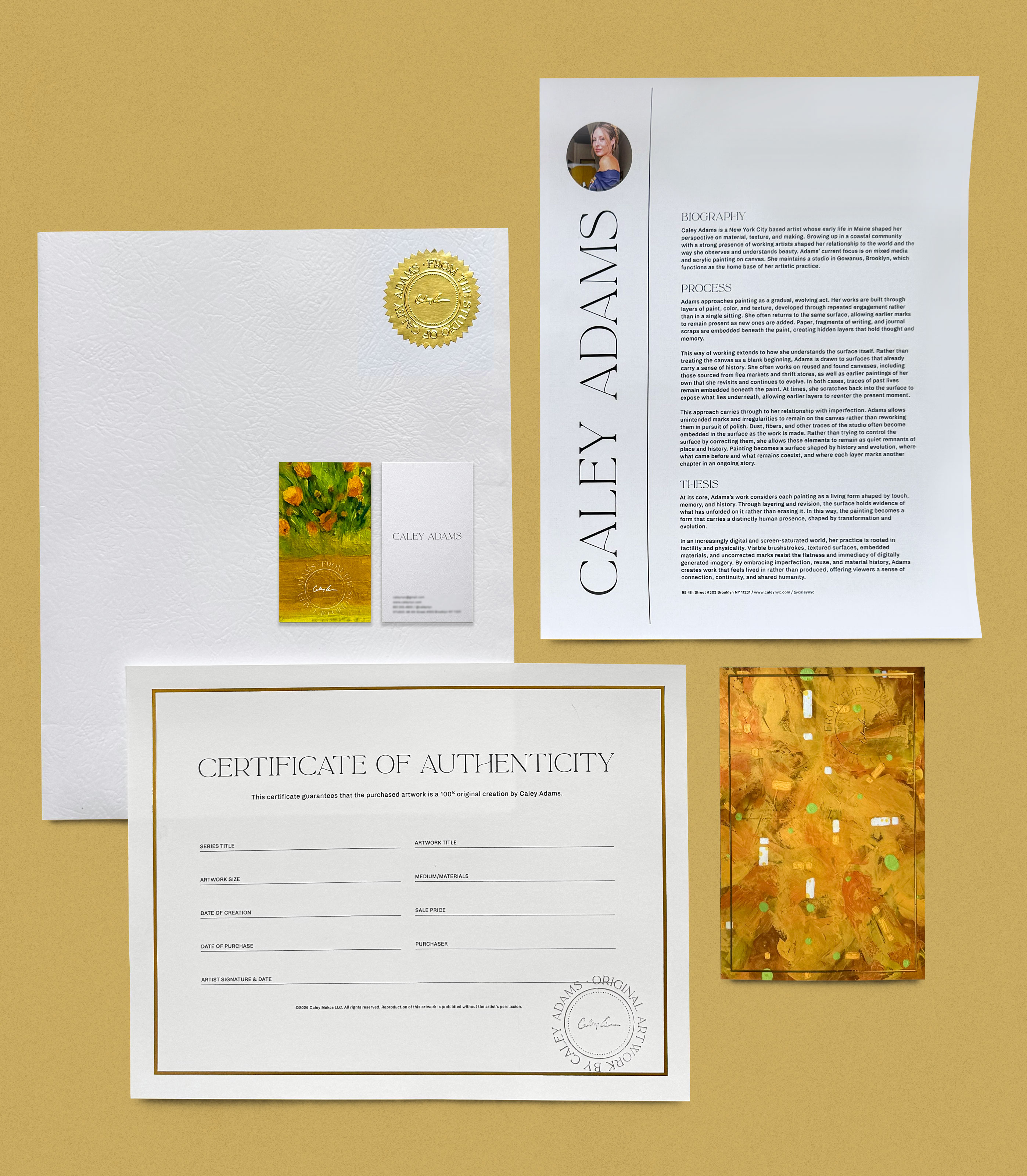 Please note that these works are intentionally imperfect. Visible marks, layered textures, and embedded materials are integral to each painting and are not considered flaws or defects. Elements such as dust, fibers, and evidence of revision are purposefully left in the surface as records of the work’s making over time. Rather than aiming for a polished or pristine finish, these paintings embrace messiness, transformation, and human touch as essential parts of their meaning. Each piece reflects a process of evolution rather than refinement, and should be understood as complete in its irregularity. Each artwork comes with an official packet containing: Certificate of Authenticity, business card, postcard, and bio sheet.